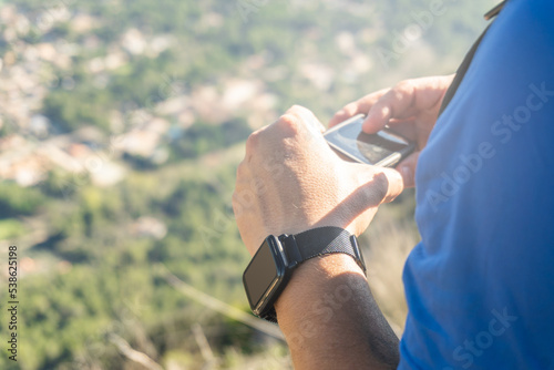 male hands with smart watch outdoors