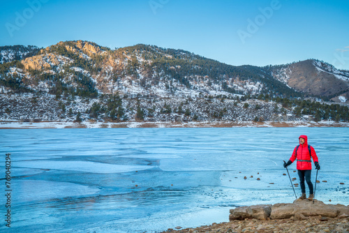 male hiker with trekking poles at a shore of frozen Horsetooth Reservoir near Fort Collins, Colorado - winter hiking concept