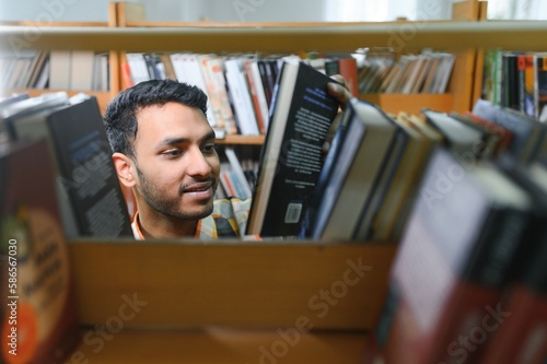 Male indian student at the library with book
