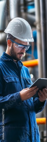 Male industrial worker in a hard hat reviewing data on a tablet in a factory setting.