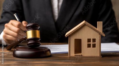 Male Judge Working with Gavel, Documents, and Toy House in Real Estate and Bankruptcy Cases