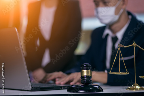 Male lawyer or judge wearing protective mask on the consult having team meeting with client, Law and Legal services concept