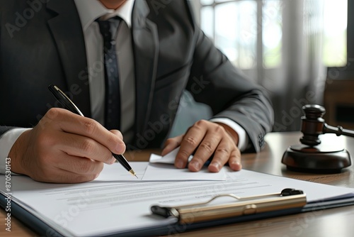 Male lawyer working with contract papers at table in office, closeup