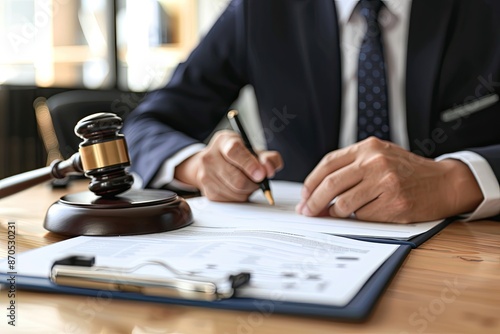 Male lawyer working with contract papers at table in office, closeup