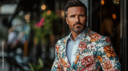 Male model showcases abstract floral-patterned suit against minimalist architectural background with a blend of elegance and masculinity