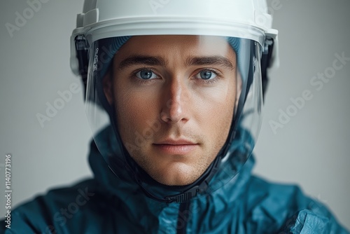 Male nurse in safety gear, including gloves and a helmet, for professional healthcare visuals.