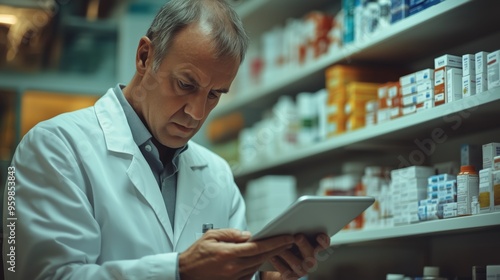 Male pharmacist reviews pharmaceutical inventory using a tablet, ensuring accurate stock management while standing in front of medication shelves.