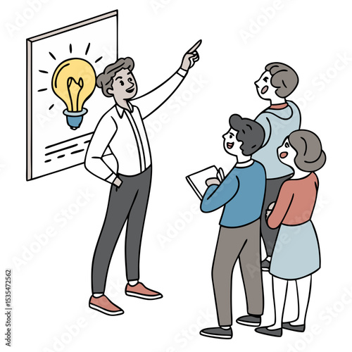 Male presenter engaging with audience, pointing at light bulb illustration on board, while three diverse individuals listen attentively, showcasing a collaborative learning environment