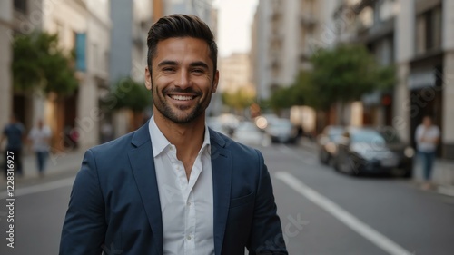 male real estate agent on busy urban street background