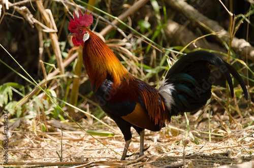 Male red junglefowl Gallus gallus gallus. Cat Tien National Park. Vietnam.