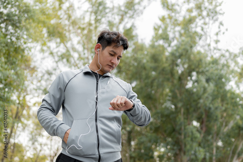 Male runner using smart watch to monitor performance. Sport man is setting up his smart watch before running in the morning