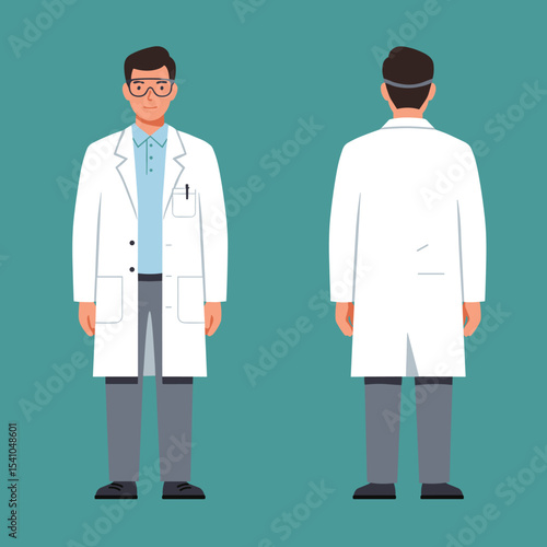 Male Scientist or Doctor in White Lab Coat, Front and Back View. Professional Man in Uniform for Medical Research or Healthcare. Flat Vector Illustration Character.