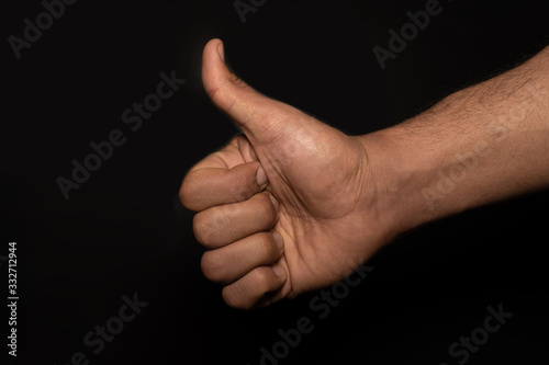 Male strong hand showing thumb up gesture. Closeup front view photograph on a black studio background.