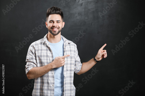Male student pointing at blackboard in classroom