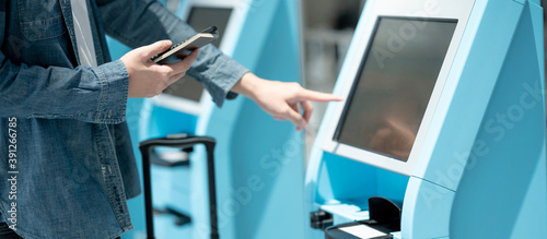 Male tourist holding passport and smartphone using self check-in kiosk in airport terminal. Travel abroad concept