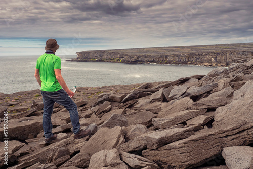 Male tourist in green shirt standing on edge of a cliff. Aran Island, Ireland. Travel and tourism. Rough Irish nature landscape. Stunning nature scene.