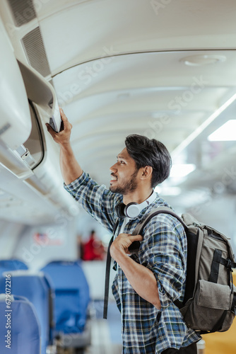 Male tourist traveling by plane Passengers place their carry-on luggage in lockers above their seats on the plane.