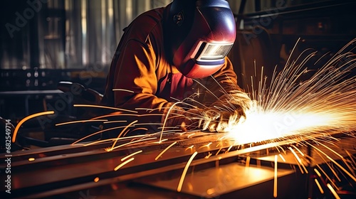 Male welder in a protective mask is welding metal. A professional works in a factory. Industrial background. Illustration for banner, poster, cover, brochure or presentation.