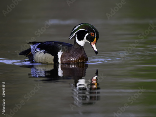Male Wood Duck Drake with Reflection Swimming in Early MorningMale Wood Duck Drake with Reflection Swimming in Early Morning