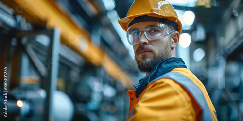 Male worker at a factory concept poster background. Man worker wearing a helmet and safety glasses. Heavy industry horizontal banner. Raster digital illustration photo style. AI artwork.