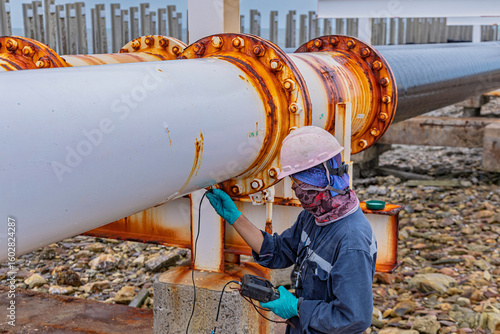 Male worker inspection and measurement thickness of rusted steel pipe, steel deterioration, widespread corrosion, and marine