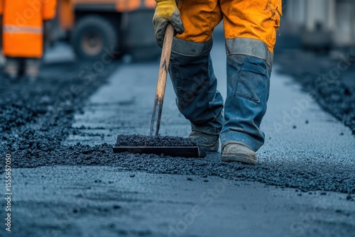 Male worker repairs asphalt road surface using a shovel during daytime in urban location