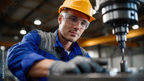 Male worker wearing safety helmet and goggles operating industrial drilling machine with focused expression in factory