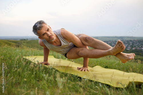 Male yoga on the grass in summer. Mature gray-haired man practicing yoga balance pose in nature