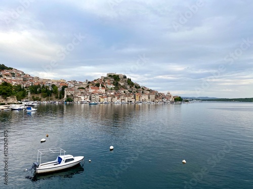 Malerische Küstenstadt mit Hafen und Booten am ruhigen Meer
