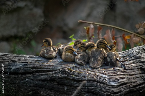 mallard duck (anas platyrhynchos ) ducklings siiting on a fallen tree
