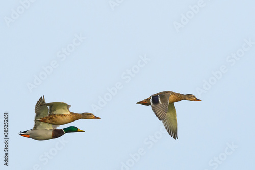 Mallard ducks in fast flight. Drake and ducks flying in the clear sky. Side view.Genus species Anas platyrhynchos.