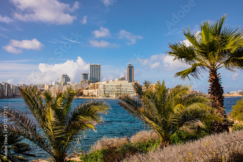 Malta-San Giuliano panorama citta con mare palme navi grattacieli