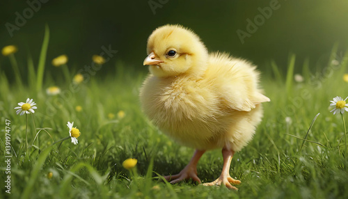 Mały żółty kurczak wielkanocny na wiosennej łące