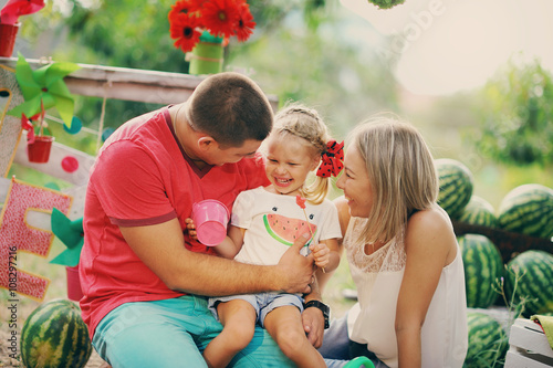Мама, папа и ребенок играют в летнем саду