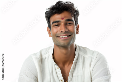 man 30 years old on a white background in casual modern clothes, his nationalitie is Brahmin (India), the characteristic features of appearance for the Brahmin (India)