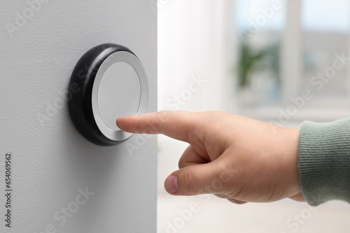 Man adjusting thermostat on white wall indoors, closeup. Smart home system