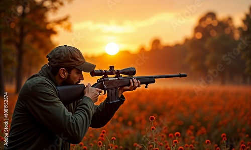 Man aiming a rifle with a scope in a field at sunset, combining focus and tranquility in a natural hunting setting