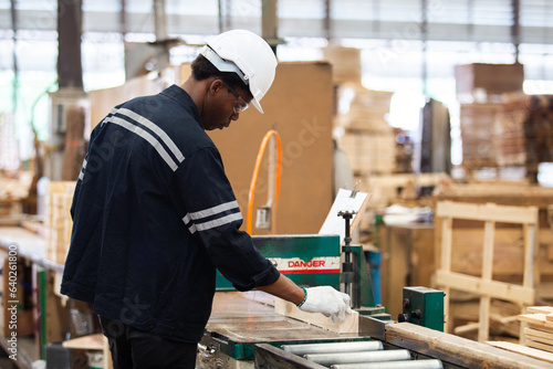 Man American African wearing safety uniform and hard hat working on wood sanding electric machines at workshop manufacturing wooden. Male carpenter worker wood warehouse industry.