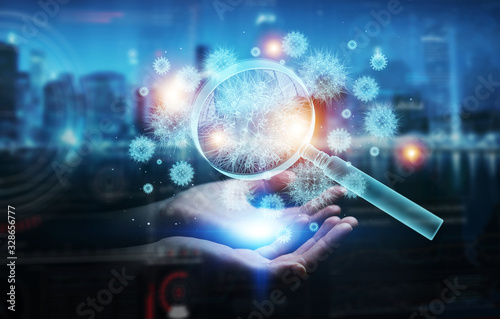 Man analyzing holographic cell projection through magnifying glass 3D rendering