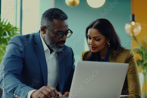 Man and a woman are looking at a laptop together. The man is wearing a blue suit and the woman is wearing a gold jacket. They seem to be discussing something important