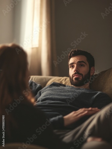 Man and a woman are sitting on a couch, the man looking at the woman. The woman is wearing a blue shirt