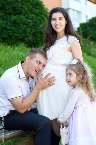 man and child listen belly of pregnant woman, happy family, couple in city park, summer season, green grass and trees