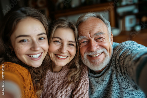 man and two young women are smiling for a picture. The man is wearing a brown shirt and the women are wearing yellow sweaters. Scene is happy and friendly