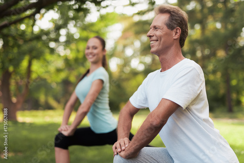 Man and woman doing warm-up in nature. Couple doing sports in nature.