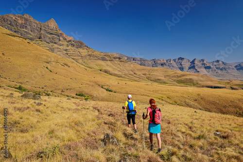 Man and woman hiking in national park at KwaZulu-Natal, Drakensberg, South Africa