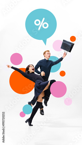 Man and woman jumping in joy with large discount symbol of percentage above them against white background with colorful elements. Creative design. Concept of sales, Black Friday, Cyber Monday
