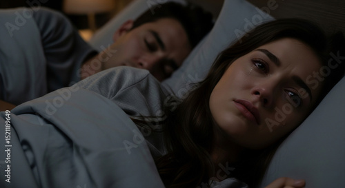 Man and woman lying in bed. Man sleeping, upset young woman awake in bed at night and crying