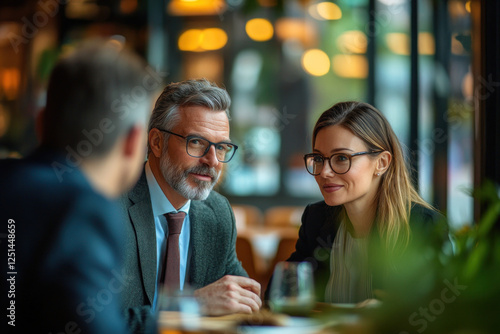 Man and woman seated at restaurant table. Man gestures while discussing. Woman listens attentively, holding a menu. Cozy ambiance with soft lighting.