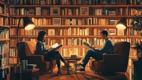 man and woman sitting in a cozy bookstore, both reading different books, surrounded by shelves filled with books, warm lighting creating a peaceful setting