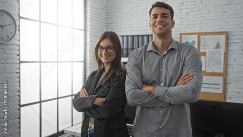 Man and woman standing confidently with arms crossed in a modern apartment, embodying professionalism and teamwork in an indoor living room setting.